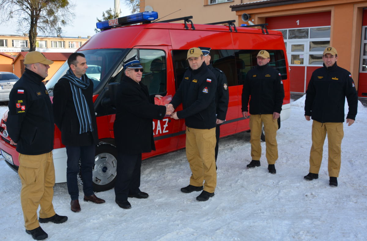 Przekazania auta Prezesowi OSP Łabuńki – Jerzemu Braneckiemu dokonał st. bryg. Jacek Sobczyński komendant miejski PSP w Zamościu w obecności Mariusza Kukiełki wójta Gminy Łabunie.