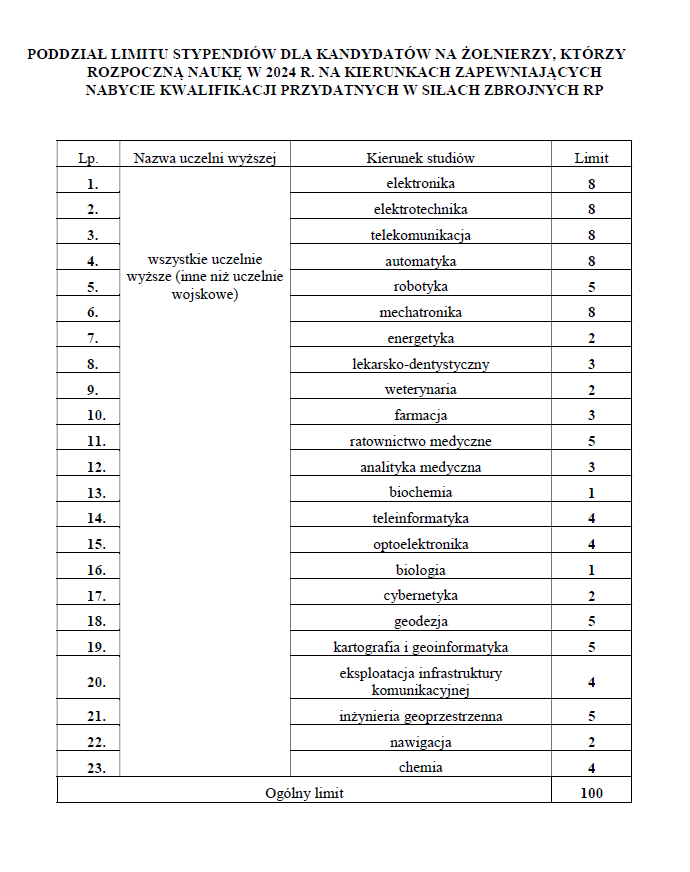 Podział limitu stypendiów dla kandydatów na żołnierzy