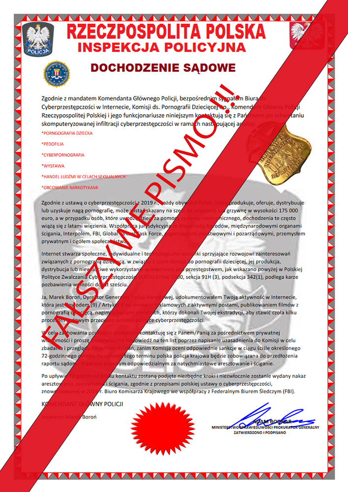 W celu uwiarygodnienia swojej wiadomości przestępcy podpisują ją, jako Komendant Główny Policji insp. Marek Boroń i Ministrerstwo Sprawiedliwości Prokurator Generalny Adam Bodnar.