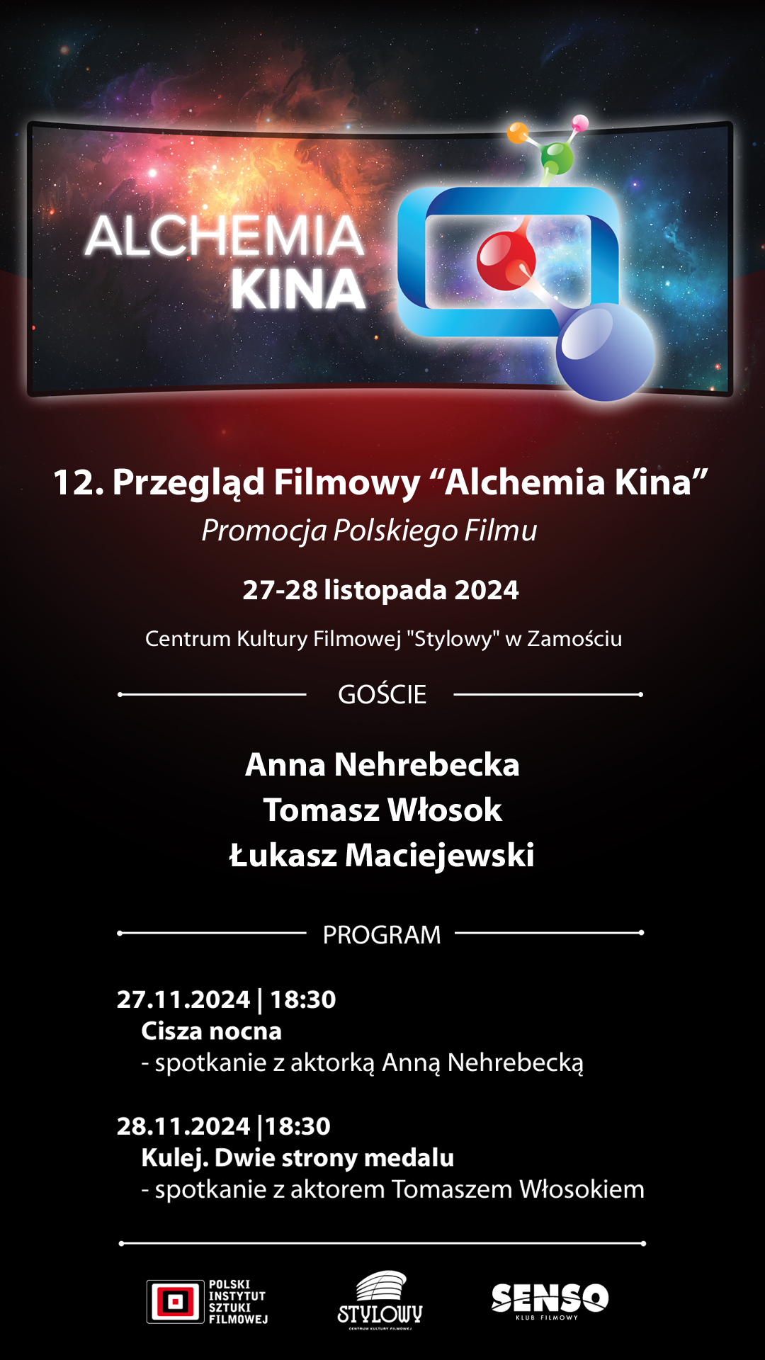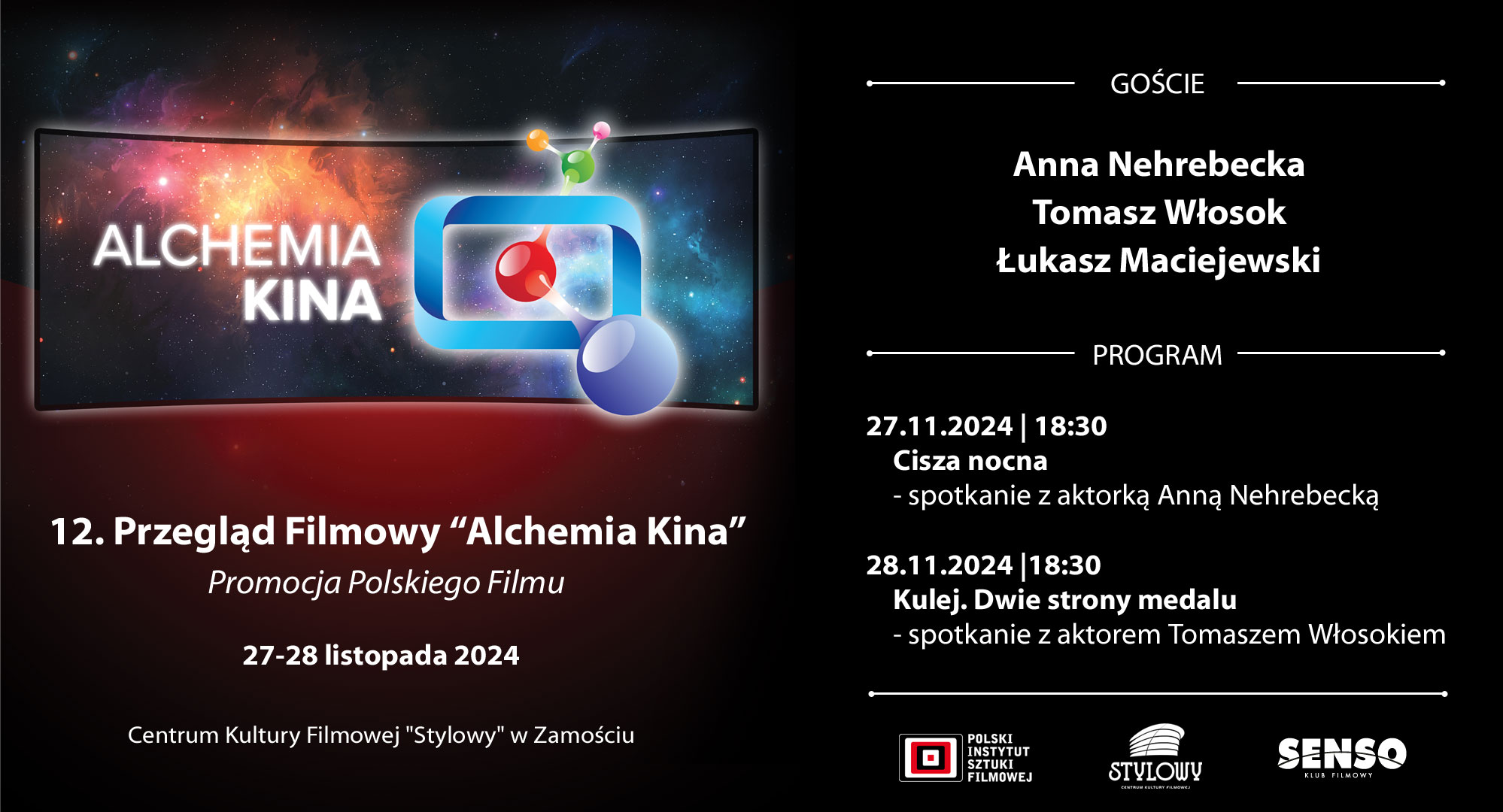 Spotkania z twórcami poprowadzi Łukasz Maciejewski – publicysta i krytyk filmowy. W alchemicznym repertuarze: "Cisza nocna" oraz „Kulej. Dwie strony medalu”. 12. Alchemia Kina odbędzie się w dniach 27-28 listopada 2024 godz. 18:30 w CKF Stylowy.