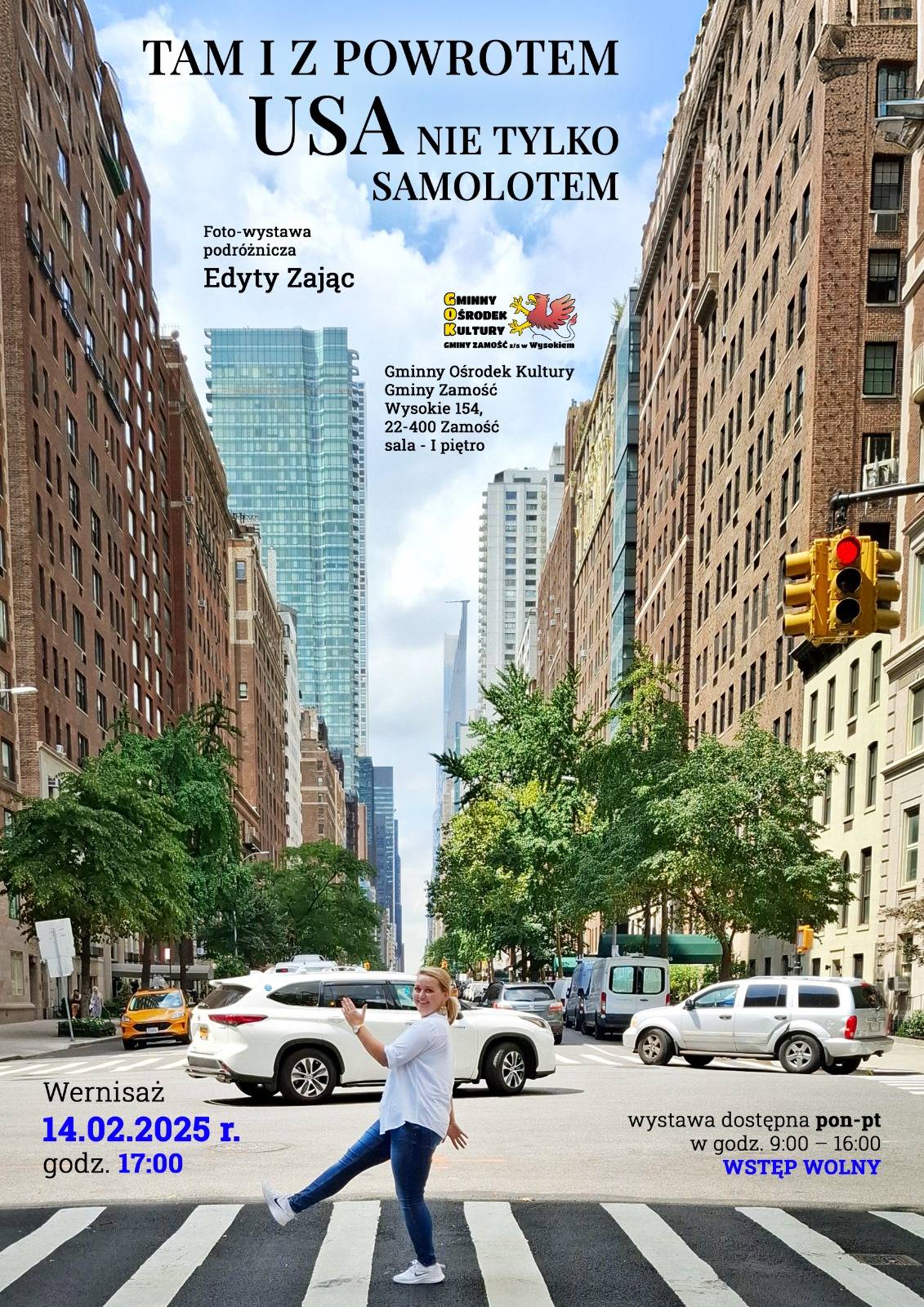 dodano: 10.02.2025Od Walentynek w Zamojskim „GOK-u Wysokie” (Wysokie 154, Gmina Zamość) będzie można oglądać foto-wystawę podróżniczą autorstwa Edyty Zając, pt. „Tam i z powrotem, USA nie tylko samolotem”. Jak powiedziała o swojej podróży Pani Edyta – „był to mój spełniony American Dream - Chicago, Las Vegas, Wielki Kanion, Los Angeles, Nowy Jork...”. Wernisaż z udziałem Autorki odbędzie się 14.02.2025 r. w siedzibie Gminnego Ośrodka Kultury Gminy Zamość z siedzibą w Wysokiem, godz. 17:00.