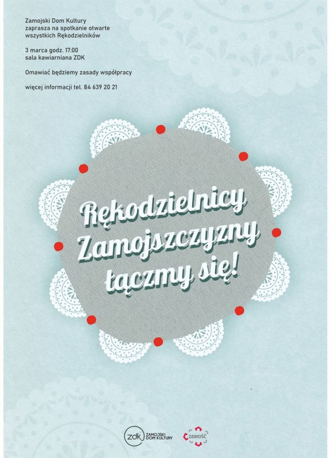 3 marca o godz. 17:00 pragniemy rozpocząć z Państwem rozmowy na temat przyszłej współpracy. Dotyczy to głównie wydarzeń plenerowych organizowanych przez ZDK. Celem spotkania jest stworzenie grupy rękodzielników prezentujących swoje wyroby w przestrzeni zamojskich rynków. Interesuje nas asortyment o wysokiej wartości artystycznej. Rozmawiać będziemy o najlepszych rozwiązaniach dotyczących spraw organizacyjnych i finansowych.