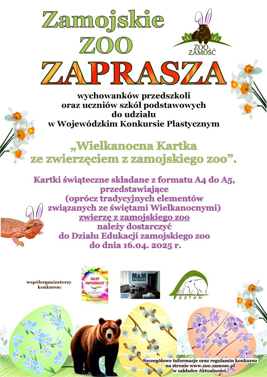dodano: 18.03.2025W związku ze zbliżającymi się Świętami Wielkanocnymi ogród zoologiczny w Zamościu zaprasza wychowanków przedszkoli oraz uczniów szkół podstawowych do udziału w Wojewódzkim Konkursie Plastycznym „Wielkanocna Kartka ze zwierzęciem z zamojskiego zoo”.