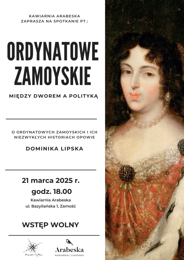 Kawiarnia Arabeska zaprasza na spotkanie z Dominiką Lipską, która odkryje przed nami niezwykłe historie Zamoyskich dam – od ich wpływów politycznych po życie na zamkowych salonach. Poznamy losy takich postaci jak Marysieńka Sobieska, Teresa Aniela z Michowskich Zamoyska, Ludwika z Poniatowskich Zamoyska czy Zofia z Czartoryskich Zamoyska. Intrygi, miłość, polityczne sojusze – to wszystko splatało się w ich życiu, kształtując nie tylko losy ich rodzin, ale i całej Rzeczypospolitej.