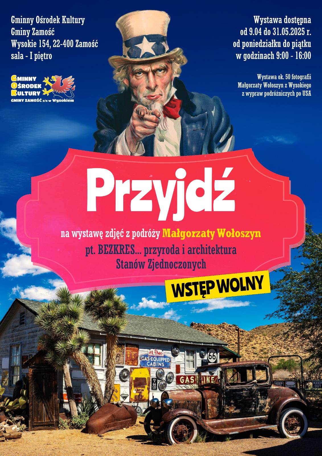 dodano: 04.04.2025„Bezkres… - przyroda i architektura Stanów Zjednoczonych” – tak zatytułowana jest foto-wystawa, autorstwa Małgorzaty Wołoszyn. Od środy, 09.04.2025 r., zapraszamy do oglądania niemal 50 fotografii w powiększonych rozmiarach 50x35 cm, które wyeksponowano w dużej sali na piętrze w siedzibie Gminnego Ośrodka Kultury Gminy Zamość w Wysokiem. Zdjęcia mają nie tylko walor podróżniczy i poznawczy, ale są też świetnie wykonane, ponieważ w orbicie zainteresowań artystycznych Pani Gosi jest nie tylko malarstwo, ale i fotografia.