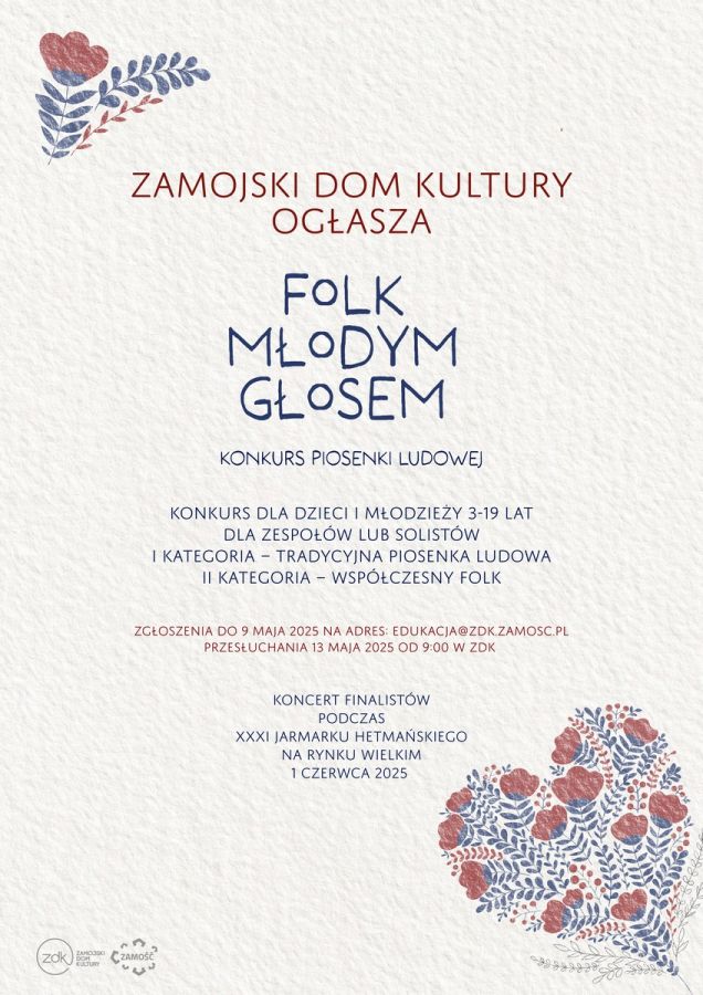 Zgłoszenia dostarczyć można do sekretariatu ZDK lub elektronicznie na adres: edukacja@zdk.zamosc.pl do 9 maja 2025.