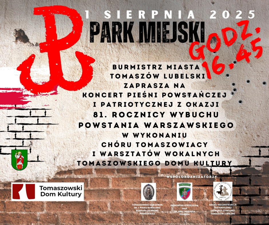 Zaprasza w dniu 1 sierpnia o godz. 16.45 na Koncert Pieśni Powstańczej i Patriotycznej z okazji 81. rocznicy wybuchu Powstania Warszawskiego, Burmistrz Miasta Tomaszów Lubelski serdecznie zaprasza na wyjątkowy koncert pieśni powstańczej i patriotycznej.