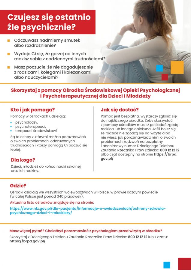 dodano: 07.08.2025Jeśli wydaje Ci się, że potrzebujesz pomocy, a twój stan psychiczny przeszkadza w normalnym funkcjonowaniu w życiu społecznym lub w edukacji, skorzystaj z pomocy specjalistów