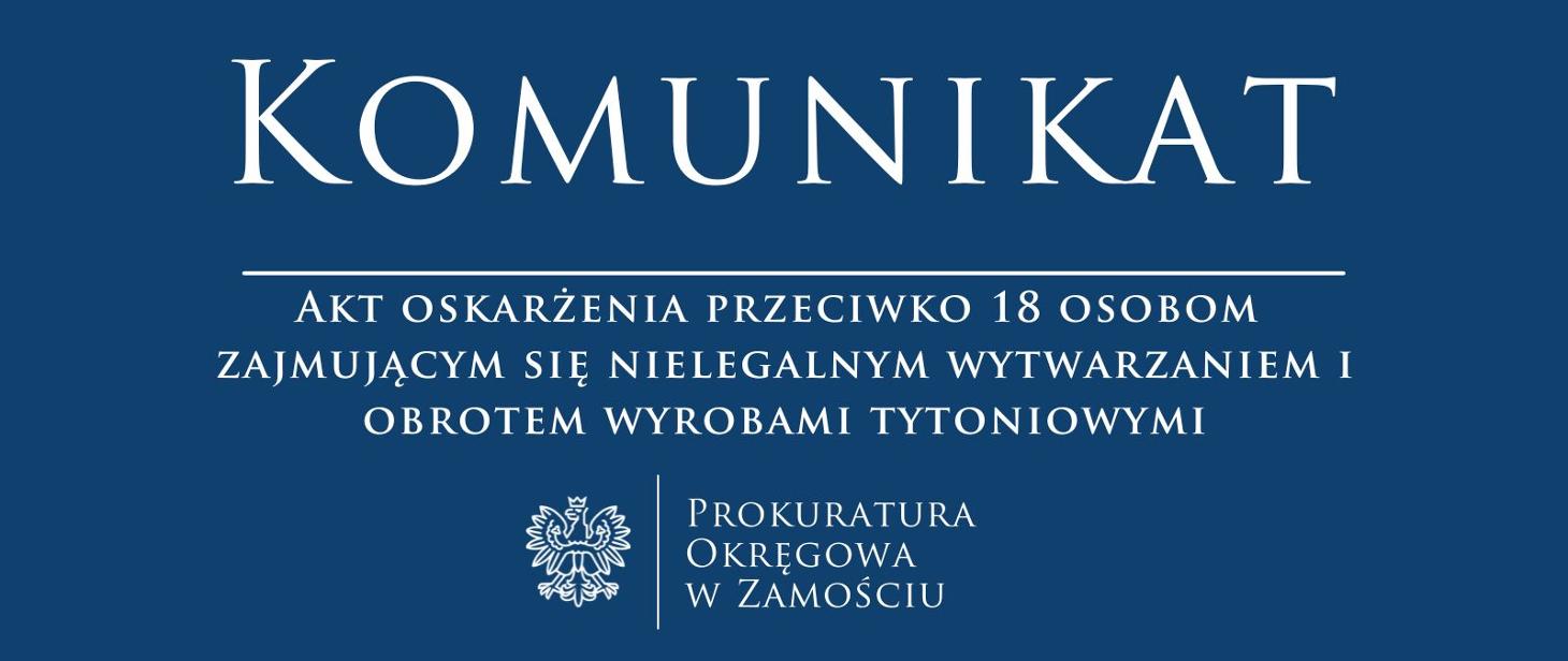 Dział do Spraw Przestępczości Skarbowej i Transgranicznej Prokuratury Okręgowej w Zamościu w dniu 24 lipca 2025r., skierował do Sądu Okręgowego w Płocku akt oskarżenia wobec 18 osób, którym zarzucono popełnienie przestępstw wyczerpujących dyspozycję m.in. art. 258 § 1 i § 3 k.k., art. 54 § 1 k.k.s. w zb. z art. 69 § 1 k.k.s., art. 12a ust. 2 w zw. z art. 12a ust. 1 w zw. z art. 14 ustawy z dnia 2 marca 2001r. o wyrobie alkoholu etylowego oraz wytwarzaniu wyrobów tytoniowych w zb. z art. 305 ust. 1 w zw. z art. 305 ust. 3 ustawy z dnia 30 czerwca 2000r. Prawo własności przemysłowej.