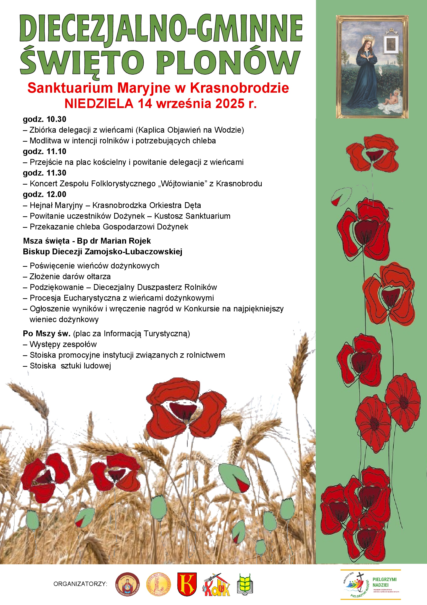 dodano: 03.09.2025Biskup Zamojsko-Lubaczowski, Duszpasterz Rolników Diecezji Zamojsko-Lubaczowskiej, Proboszcz Parafii Nawiedzenia NMP w Krasnobrodzie i Burmistrz Krasnobrodu serdecznie zapraszają na Diecezjalno-Gminne Święto Plonów, które odbędzie się w Krasnobrodzie 14 września 2025r.