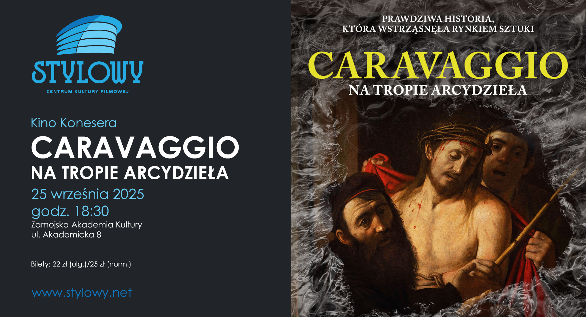 dodano: 16.09.2025Zamojska Akademia Kultury oraz Klub Filmowy „Senso” serdecznie zapraszają na spotkanie filmowe z cyklu Kino Konesera. 25 września 2025 o godz. 18:30 na ekranie przedpremierowo „Caravaggio: Na tropie arcydzieła”. To trzymający w napięciu dokumentalny thriller o sztuce, obsesji i pościgu za arcydziełem. Film odsłania kulisy rynku sztuki, potęgi przypadku i fascynujących losów arcydzieł, które znikają i powracają jak duchy przeszłości. Jednocześnie zapoznaje widza z niezwykłym warsztatem i twórczością Caravaggia. Ten dokument ogląda się jak dobry thriller! Seans odbędzie się w sali kinowej Zamojskiej Akademii Kultury, II piętro, wejście od ul. Akademickiej 8 i ul. Pereca (winda).