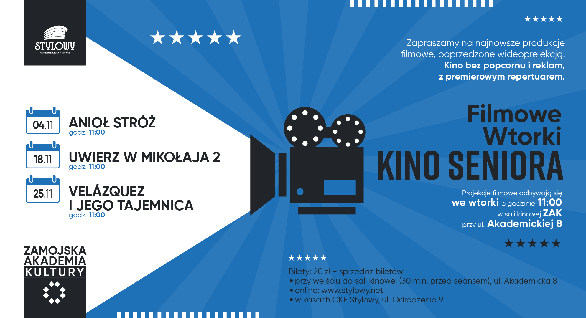 W repertuarze najnowsze produkcje filmowe, poprzedzone wideoprelekcją. To kino bez popcornu i reklam, z premierowym repertuarem. Projekcje filmowe odbywają się we wtorki o godzinie 11:00, w sali kinowej Zamojskiej Akademii Kultury, ul. Akademicka 8, II piętro, wejście od ul. Akademickiej i Pereca (winda). Bilety: 20 zł.