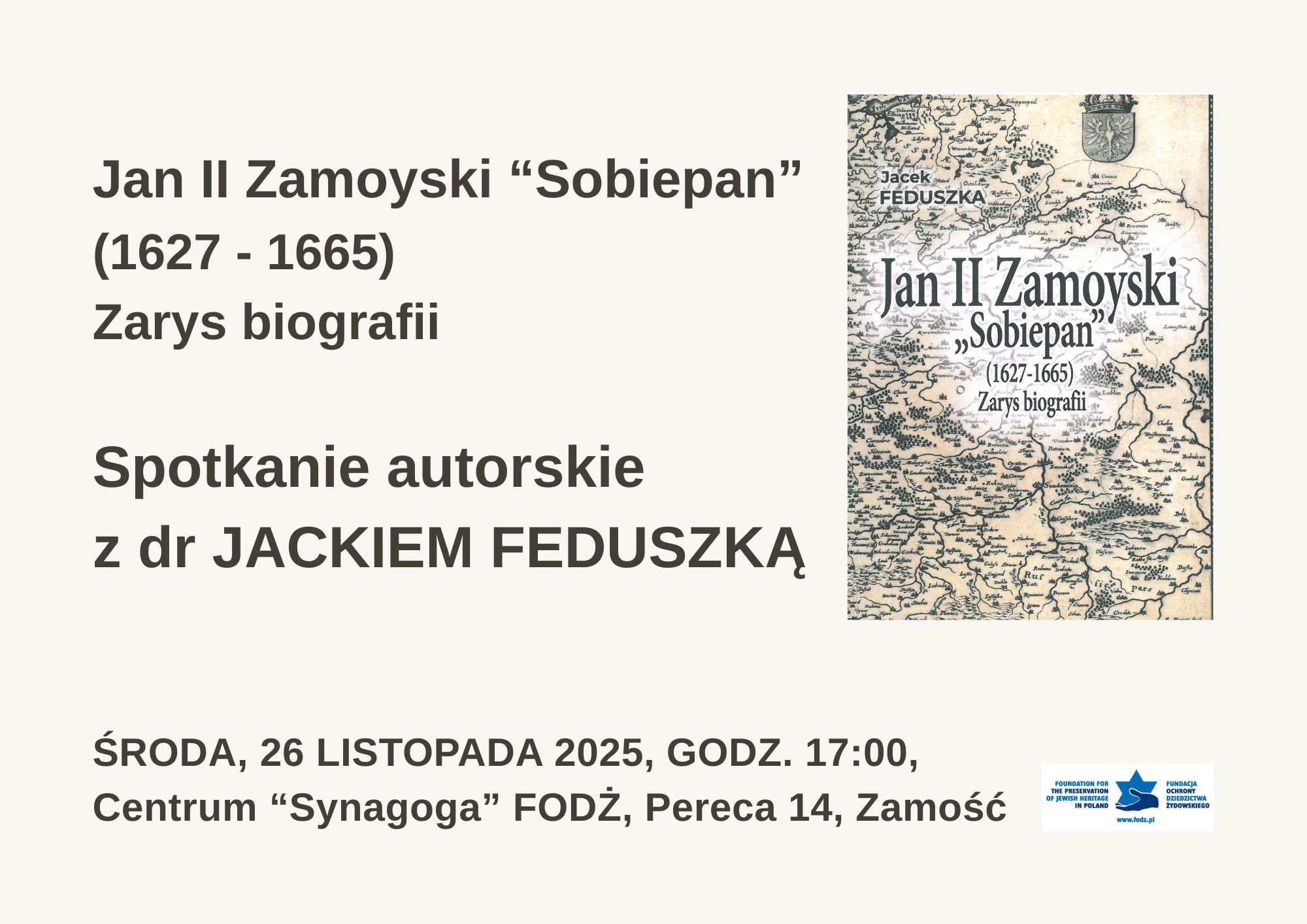dodano: 17.11.2025Zapraszamy na spotkanie z dr Jackiem Feduszką, poświęcone jego najnowszej książce „Jan II Zamoyski „Sobiepan” (1627-1665). Zarys biografii.”