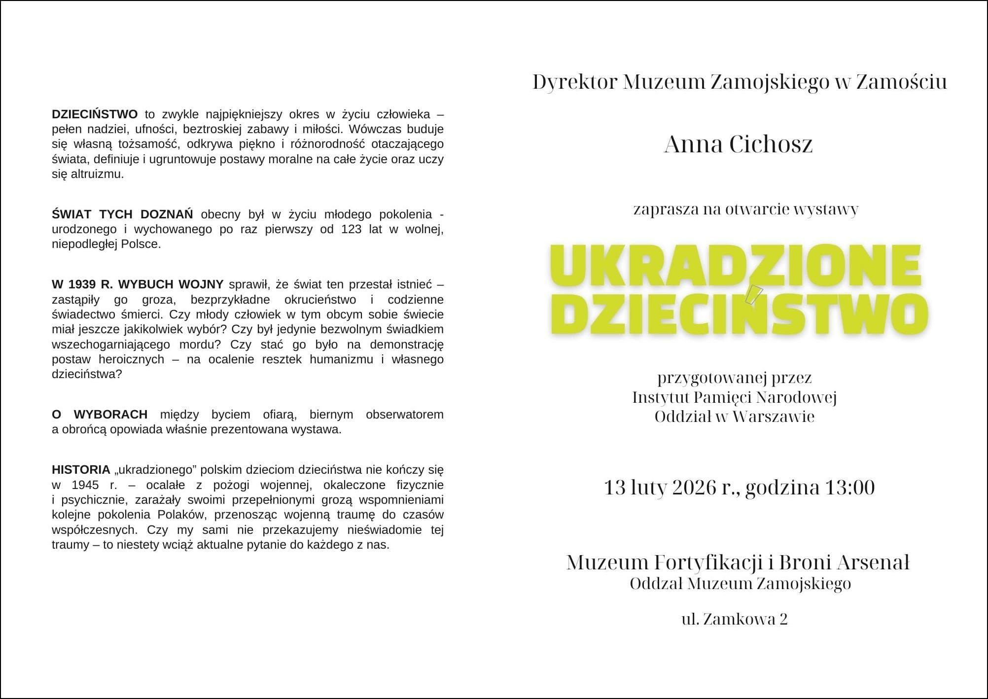 dodano: 10.02.202613 lutego 2026 roku, o godzinie 13:00 w Muzeum Fortyfikacji i Broni „Arsenał” w Zamościu odbędzie się wernisaż wystawy przygotowanej przez Instytut Pamięci Narodowej Oddział w Warszawie pt.: „Ukradzione dzieciństwo”.