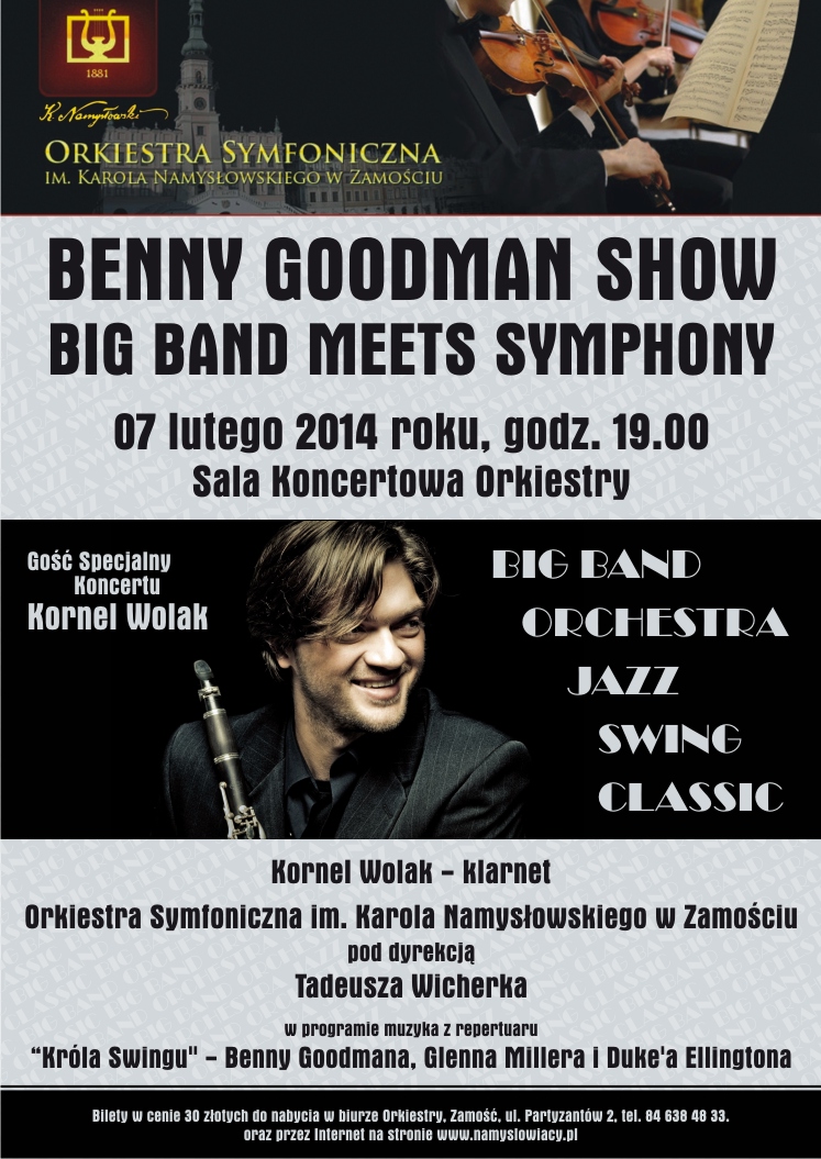 Serdecznie zapraszamy na koncert w dniu 07 luty 2014 roku, godz. 19.00 - Sala Koncertowa Orkiestry Benny Goodman show Big Band Meets Symphony wykonawcy :