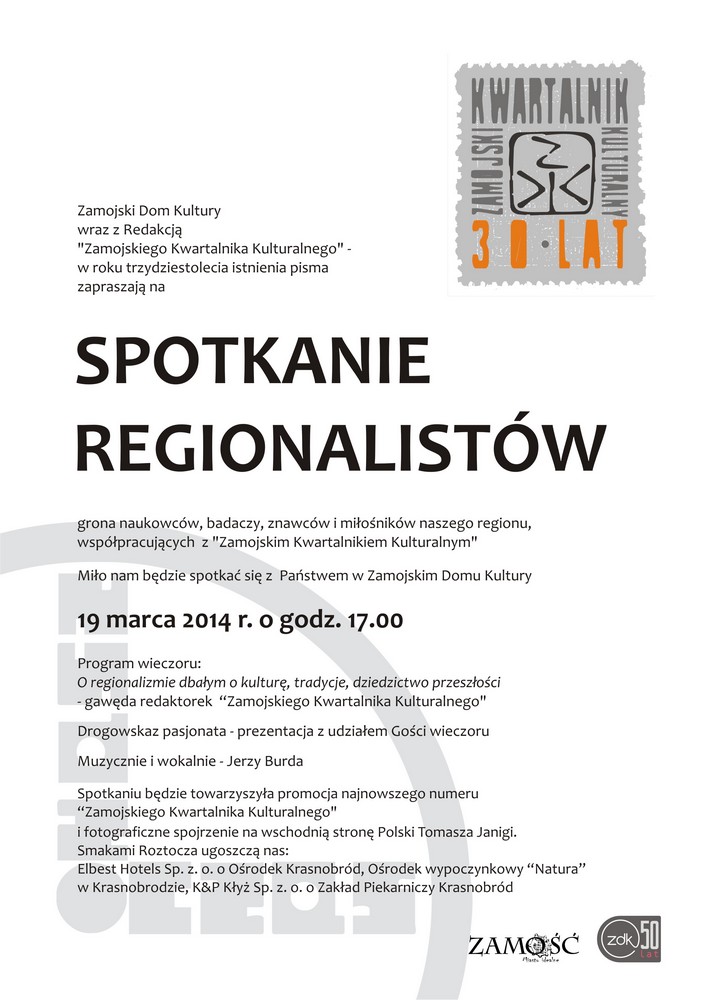 dodano: 13.02.2014Zamojski Dom Kultury wraz z Redakcją „Zamojskiego Kwartalnika Kulturalnego” w roku trzydziestolecia istnienia pisma zapraszają na SPOTKANIE REGIONALISTÓW – grona naukowców, badaczy, znawców i miłośników naszego regionu, współpracujących z „Zamojskim Kwartalnikiem Kulturalnym”.