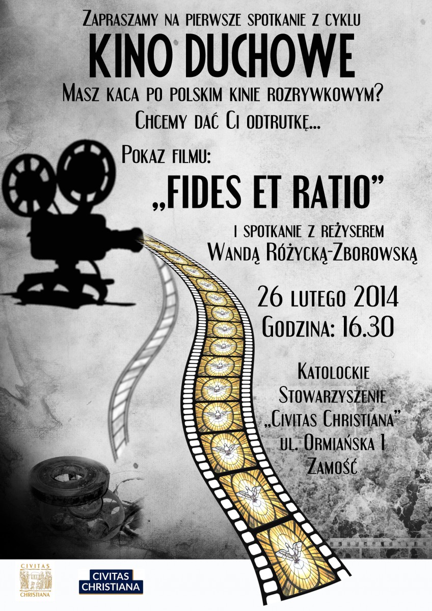 dodano: 17.02.2014Zapraszam na pierwsze spotkanie z cyklu ,,Kino Duchowe" organizowane przez Katolickie Stowarzyszenie ,,Civitas Christiana" w Zamościu. Pokaz filmu ,,Fides et Ratio" oraz spotkanie z reżyserem Wandą Różycką Zborowską odbędą się 26.02.2014 r. (środa) o godz 16:30 w lokalu Katolickiego Stowarzyszenia ,,Civitas Christiana" ul. Ormiańska 1.