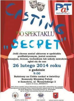 Serdecznie zapraszamy uczniów szkół gimnazjalnych i ponadgimnazjalnych z Zamościa na casting do spektaklu edukacyjno-profilaktycznego "Sekret". Casting odbędzie się 26 lutego w świetlicy Komendy Miejskiej Policji w Zamościu /wejście od baru Aspirant/. Początek godz. 9.00. Podczas castingu wyłoniona zostanie grupa młodzieży, która następnie przygotuje przedstawienie teatralne pod tytułem "Sekret".
