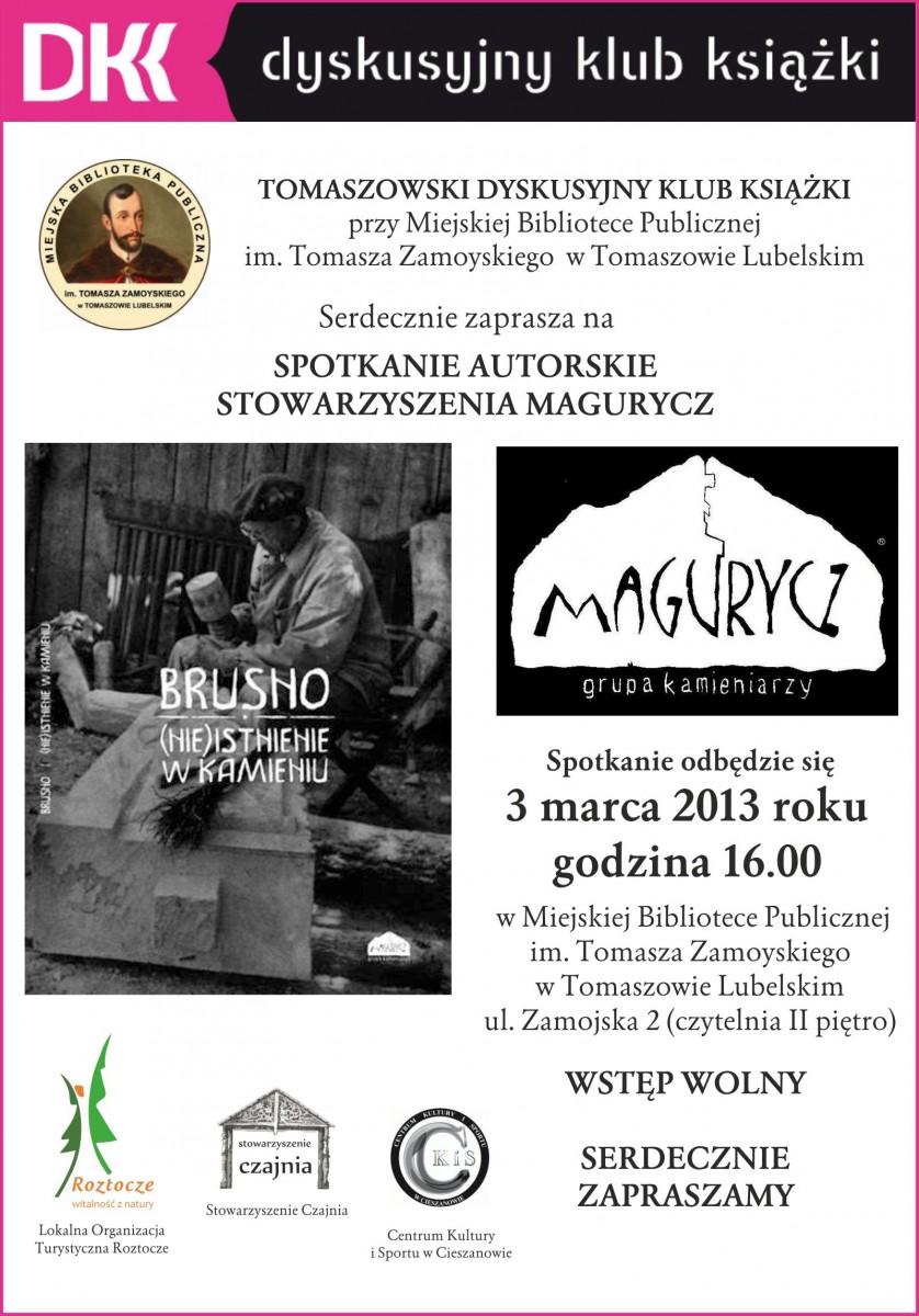 dodano: 24.02.2014Dyskusyjny Klub Książki przy Miejskiej Bibliotece Publicznej im. Tomasza Zamoyskiego w Tomaszowie Lubelski oraz Lokalna Organizacja Turystyczna Roztocze zapraszają na spotkanie z autorami książki „Brusno – (nie)istnienie w kamieniu” wydanym przez Stowarzyszenie Magurycz.