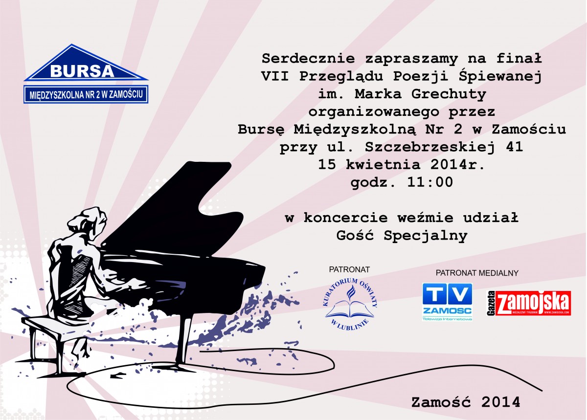 Dnia 15 kwietnia 2014 roku, o godzinie 11.00, w auli Bursy Międzyszkolnej Nr 2 w Zamościu, odbędzie się VII Finał Przeglądu Poezji Śpiewanej im. Marka Grechuty, w którym wezmą udział uczniowie i wychowankowie internatów, burs oraz szkół ponadgimnazjalnych województwa lubelskiego. Konkurs został objęty Patronatem Lubelskiego Kuratora Oświaty, pana Krzysztofa Babisza. Głównym celem Przeglądu jest przybliżenie sylwetki i twórczości Marka Grechuty, zachęcenie młodzieży do rozwijania zainteresowań i uzdolnień muzycznych oraz odkrywanie i promocja muzycznych talentów. Finaliści zaprezentują dwa utwory w języku polskim, w tym jeden autorstwa Marka Grechuty oraz drugi utwór dowolny, utrzymany w konwencji poezji śpiewanej. Uczestnikom zostaną wręczone nagrody i upominki ufundowane przez Lubelskiego Kuratora Oświaty i Urząd Miasta Zamość.