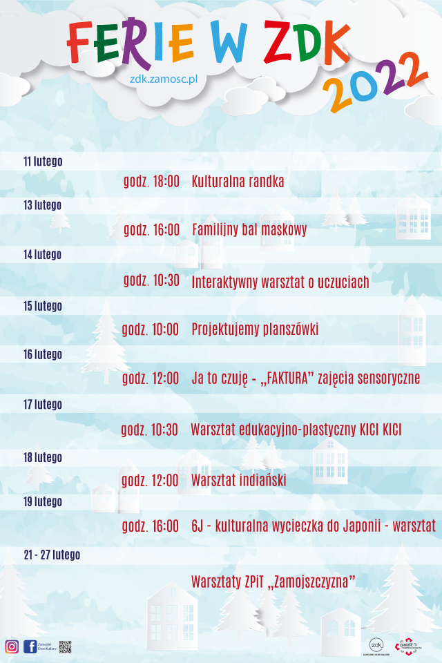 Harmonogram ferii z ZDK, opis wydarzeń wraz z regulaminem uczestnictwa znajduje się na stronie www.zdk.zamosc.pl. Bilety wstępu można nabyć w sekretariacie Zamojskiego Domu Kultury oraz na biletyna.pl.