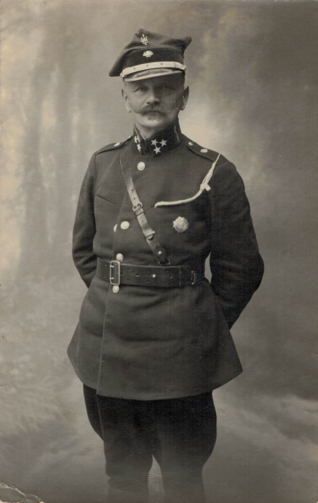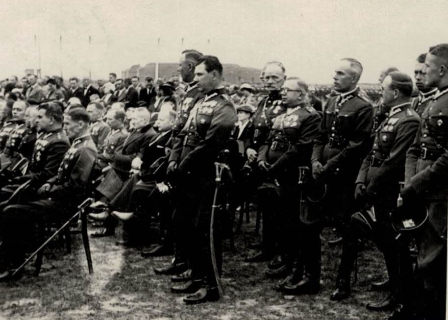 Dwie fotografie to portrety Jana Strzyżowskiego gdzie na jednej występuje w hełmie paradnym. Kolejne zdjęcie przedstawia Jana Strzyżowskiego prowadzącego ulicą Szczebrzeską strażacka orkiestrę za którą maszeruje kompania strażacka ze sztandarem. Czwarte zdjęcie przedstawia uroczystości 9 Pułku Piechoty Legionów z udziałem Jana Strzyżowskiego podczas nabożeństwa na Rotundzie.