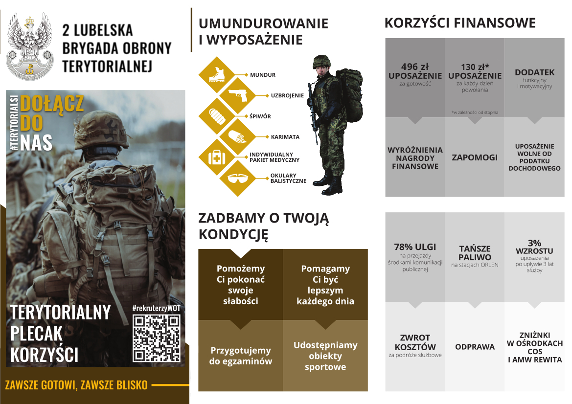 Mieszkańcy Lubelszczyzny, którzy są zainteresowani służbą w 2 LBOT, mogą skorzystać z ostatniego w tym roku szkolenia podstawowego tzw. „szesnastki”, która rozpocznie się 17 listopada br., a zakończy uroczystą przysięgą 2 grudnia br. w Zamościu. Ponadto przyjęcie kandydatów do terytorialnej służby wojskowej odbędzie się 16 grudnia br., a kontynuacja tego szkolenia nastąpi podczas ferii zimowych tj. w terminie 29.01-11.02.2024 r.