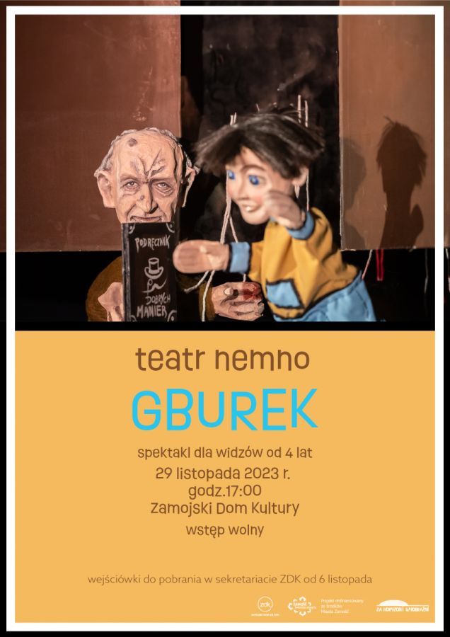OPIS SPEKTAKLU: Reżyseria: Henryk Hryniewicki Scenografia: Dagmara Jemioła - Hryniewicka Gburek to opowieść o niegrzecznym chłopcu, który nie zna dobrych manier. Gdy jego zachowanie staje się już nie do zniesienia mama postanawia wysłać go profesora Moraua - specjalisty od dżentelmenerii. Czy profesorowi uda się nauczyć Gburka dobrych manier? Kogo jeszcze spotka na swojej drodze? Dowiecie się o tym podczas przedstawienia... Spektakl dla widzów od lat 4 Wstęp wolny. Wejściówki do pobrania w sekretariacie ZDK od 6 listopada. Spektakl dofinansowany w ramach Miejskiego Programu Profilaktyki i Rozwiązywania Problemów Alkoholowych oraz Przeciwdziałania Narkomanii w 2023 r.