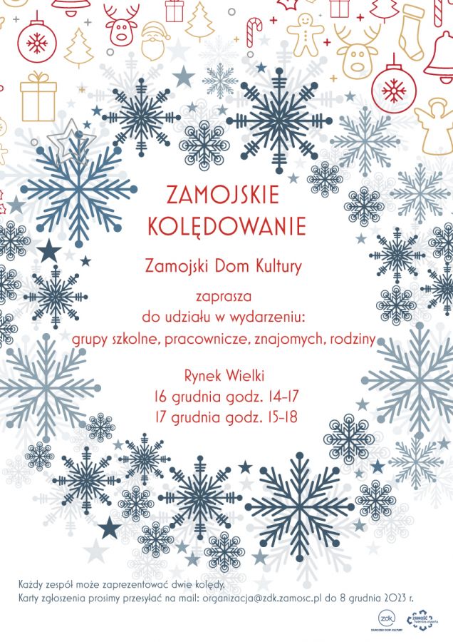 dodano: 13.11.2023Zamojski Dom Kultury zaprasza WSZYSTKICH do wspólnego kolędowania! 16 grudnia 14:00-17:00 Rynek Wielki, 17 grudnia 15:00-18:00 Rynek Wielki.