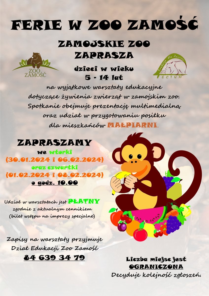 Zamojskie zoo stawia na aktywność. Nie tak oczywistą jak sanki, narty czy łyżwy lecz AKTYWNE ... przygotowanie posiłku dla zwierząt z zamojskiego zoo. Mamy nadzieję, że propozycja warsztatów edukacyjnych, podczas których uczestnicy dowiedzą się co jedzą egzotyczni mieszkańcy zamojskiej Małpiarni i samodzielnie przygotują dla nich posiłek, spotka się z zainteresowaniem dzieci i ich opiekunów.