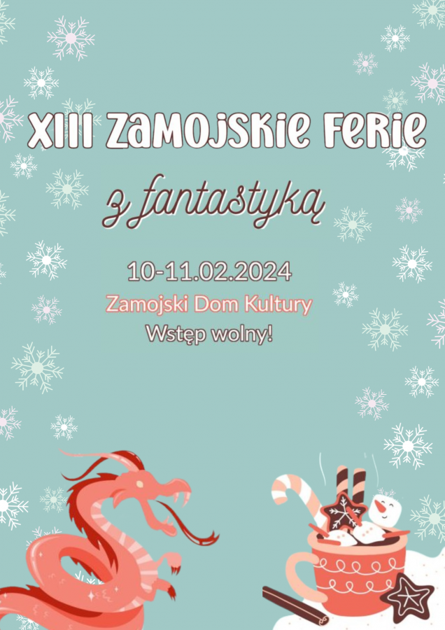 dodano: 18.01.2024Fantastyka powraca do Zamościa. Zamojskie Stowarzyszenie Kulturalne „Czerwony Smok” serdecznie zaprasza na trzynastą edycję Zamojskich Ferii z Fantastyką!