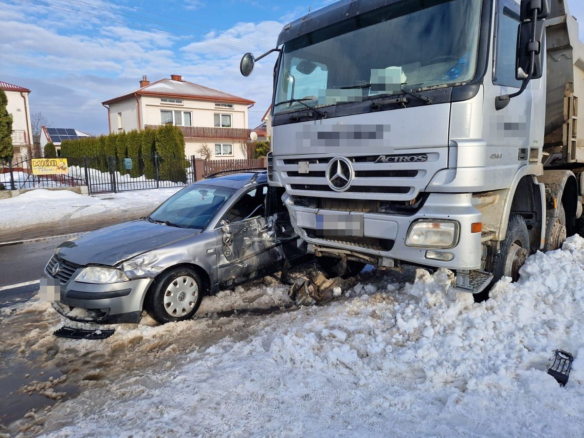 Ze wstępnych ustaleń wynika, że 63-letni mieszkaniec gm. Krynice kierujący Volkswagenem wykonując manewr skrętu w lewo, nie zauważył, że jest wyprzedzany przez Mercedesa i uderzył w jego bok. Na skutek uderzenia, kierujący Passatem i jego pasażerka potrzebowali pomocy medycznej i karetką pogotowia ratunkowego zostali przewiezieni do szpitala. 50-letni mieszkaniec gm. Lubycza Królewska kierujący ciężarówką nie odniósł obrażeń. Badanie trzeźwości kierujących wykazało, że byli trzeźwi. Policjanci zatrzymali dowody rejestracyjne pojazdów z uwagi na ich uszkodzenia.