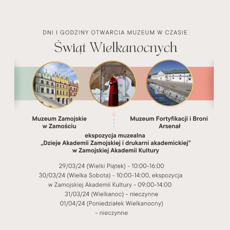 dodano: 19.03.2024Informujemy o zmienionych godzinach otwarcia naszych placówek w trakcie zbliżających się Świąt Wielkanocnych, tj. Muzeum Zamojskiego w Zamościu, Muzeum Fortyfikacji i Broni Arsenał – oddział Muzeum Zamojskiego, oraz ekspozycji „Dzieje Akademii Zamojskiej i drukarni akademickiej” prezentowanej w Zamojskiej Akademii Kultury.