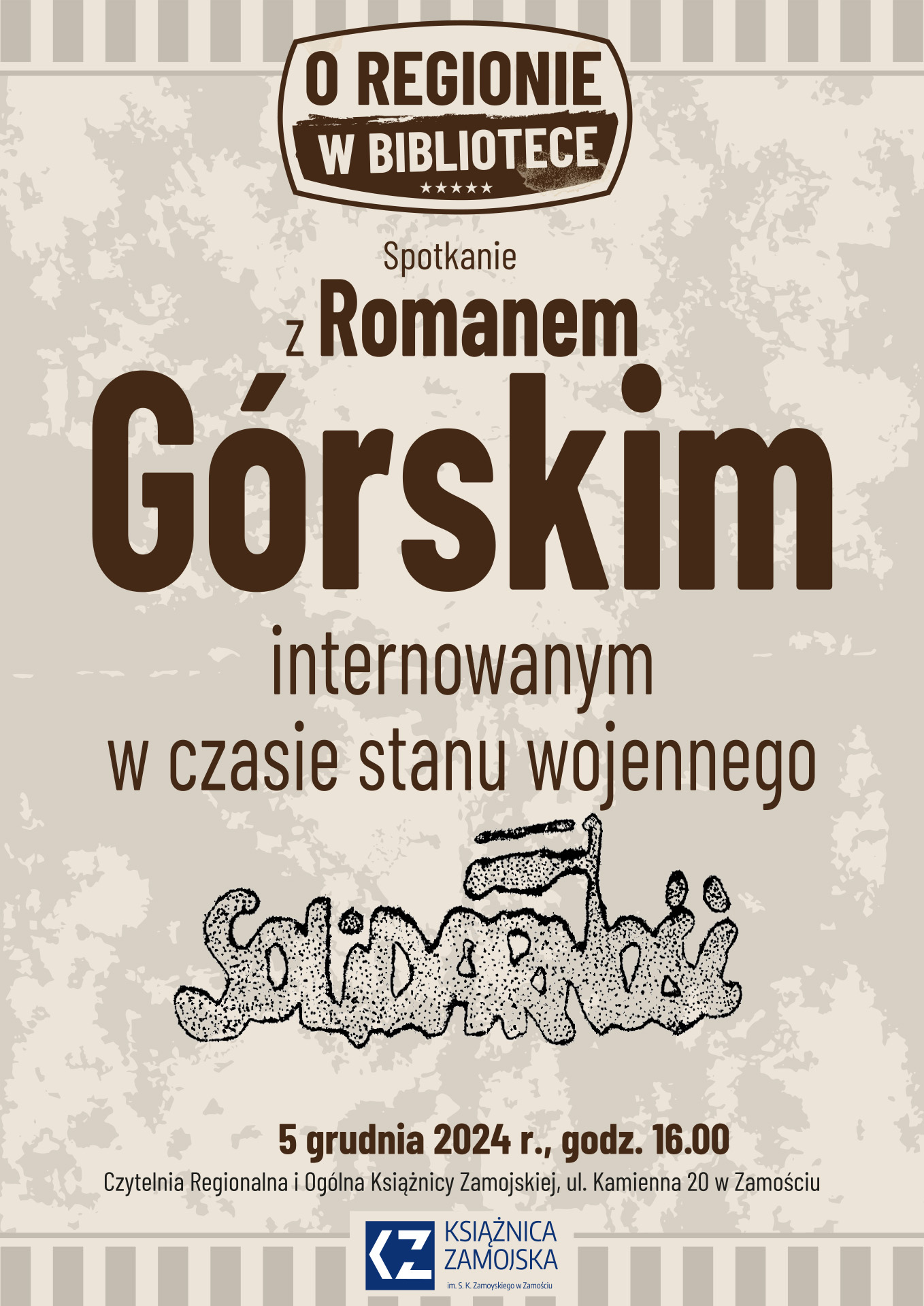 13 grudnia mija kolejna rocznica wprowadzenia w Polsce stanu wojennego. Te dramatyczne wydarzenia nie ominęły również Zamościa. Podczas spotkania oddamy głos świadkowi i uczestnikowi tych wydarzeń Romanowi Górskiemu, który został tego dnia internowany, a następnie osadzony w ośrodkach Krasnystaw – Włodawa – Kwidzyn. Opowie nam o momencie internowania, pobycie w ośrodkach oraz o sytuacji po odzyskaniu wolności.