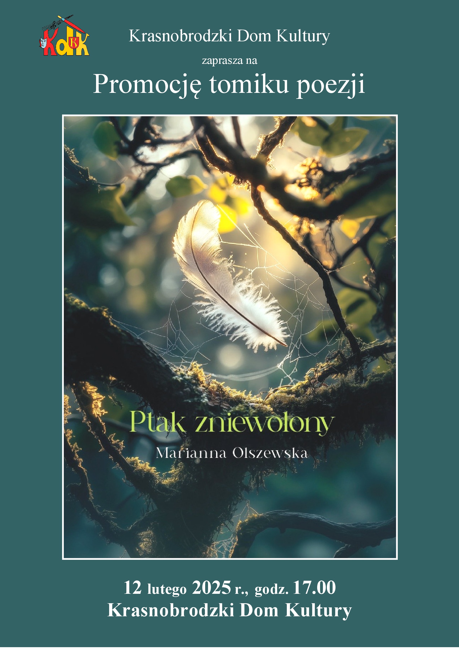 dodano: 06.02.2025Serdecznie zapraszamy na promocję tomiku poezji MARIANNY OLSZEWSKIEJ „Ptak zniewolony” , która odbędzie się w środę 12 lutego 2025r. o godzinie 17.00. w Krasnobrodzkim Domu Kultury z udziałem zespołu folklorystycznego 'Wójtowianie”.