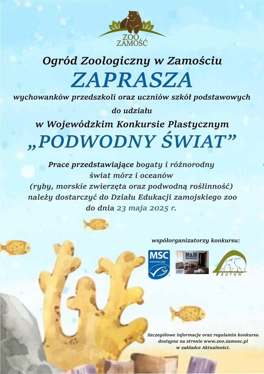 dodano: 07.05.2025W związku ze zbliżającymi się obchodami Światowego Dnia Oceanów (8 czerwca) zamojski ogród zoologiczny zaprasza do udziału w Wojewódzkim Konkursie Plastycznym „PODWODNY ŚWIAT ".