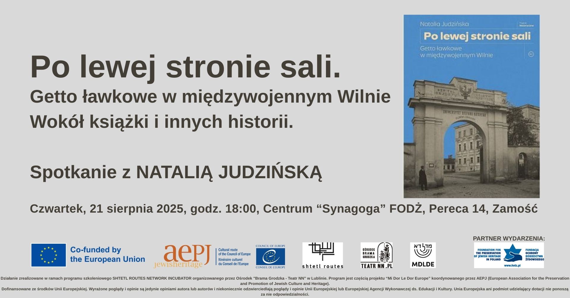 dodano: 18.08.2025Centrum „Synagoga’ Fundacji Ochrony Dziedzictwa Żydowskiego serdecznie zaprasza na spotkanie z panią Natalią Judzińską – „Po lewej stronie sali. Getto ławkowe w międzywojennym Wilnie”. Wokół książki i innych historii.