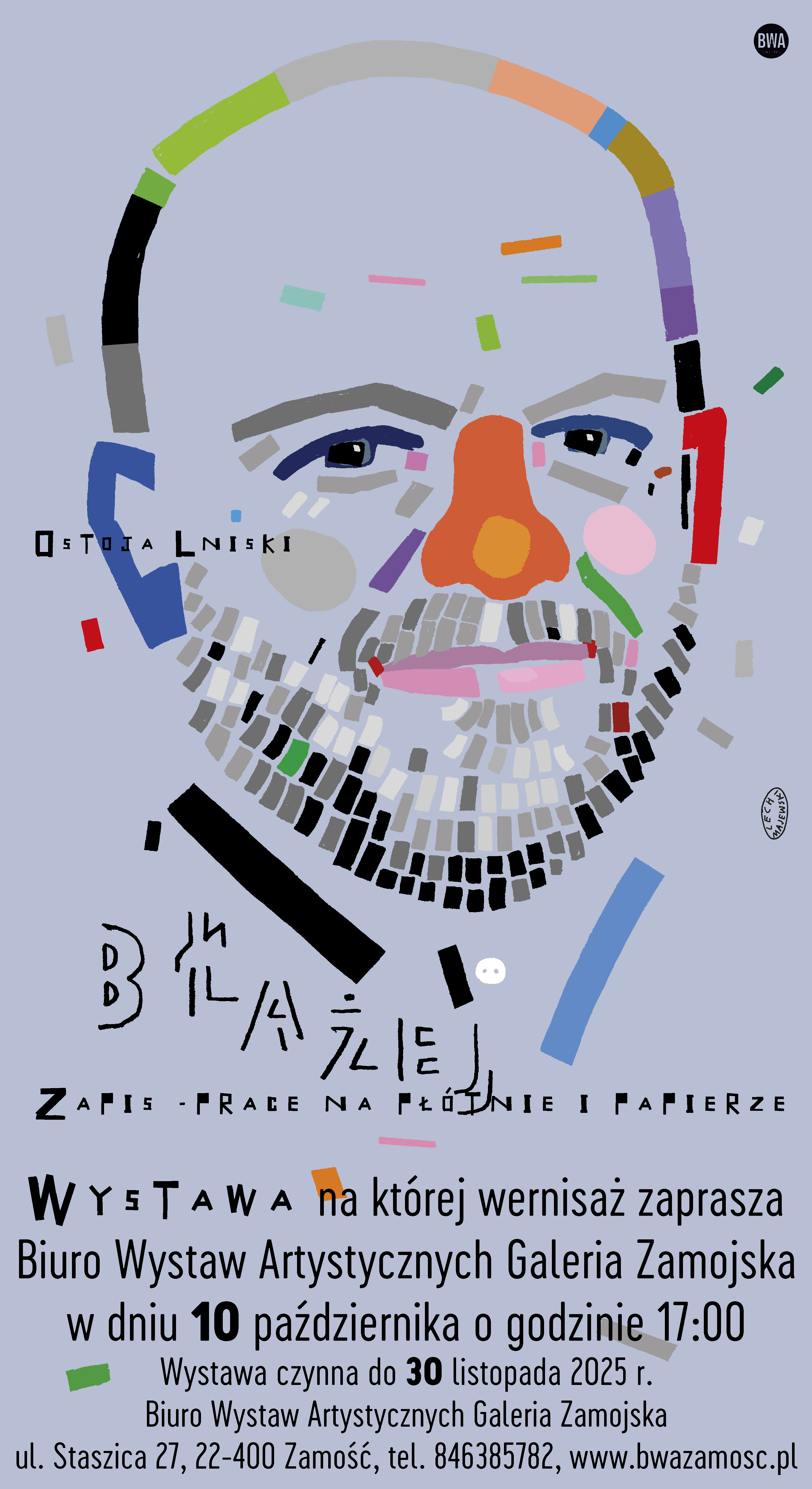 Prace w zbiorach Muzeum Narodowego w Warszawie, Biblioteki Narodowej, Muzeum Warszawy, Muzeum Okręgowego im. Leona Wyczółkowskiego w Bydgoszczy, Wojewódzkiej Biblioteki Publicznej im. Witolda Gombrowicza w Kielcach, Biblioteki Uniwersytetu Łódzkiego, Muzeum Historyczno-Etnograficznego im. Juliana Rydzkowskiego w Chojnicach, Muzeum Ziemi Chełmskiej im. Wiktora Ambroziewicza w Chełmie, Muzeum Akademii Sztuk Pięknych w Warszawie oraz w kolekcji grafiki Galerii Sztuki Współczesnej BWA w Katowicach. BWA - Galeria Zamojska prezentuje prace Błażeja Ostoi Lniskiego – malarza, grafika, projektanta książek i plakatów, profesora sztuk plastycznych i rektora Akademii Sztuk Pięknych w Warszawie. Artysta znany jest z głębokiego, analitycznego podejścia do obrazu i formy, a jego twórczość łączy w sobie inspiracje tradycją akademicką, i refleksją nad współczesnością.