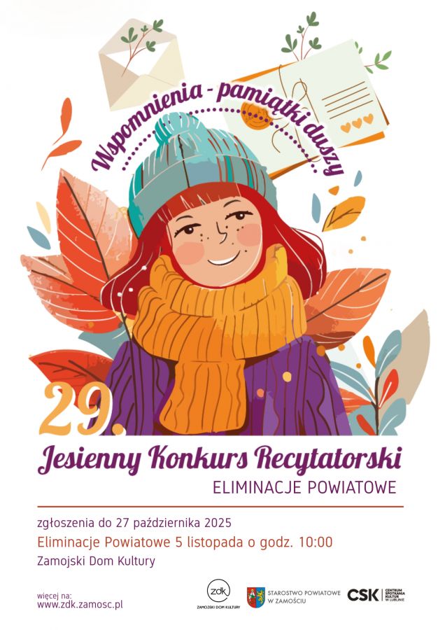 dodano: 13.10.2025Zapraszamy uczniów szkół podstawowych i ponadpodstawowych, studentów, a także wszystkich dorosłych miłośników recytacji z Zamościa i powiatu zamojskiego do udziału w przeglądzie powiatowym 29. Jesiennego Konkursu Recytatorskiego.