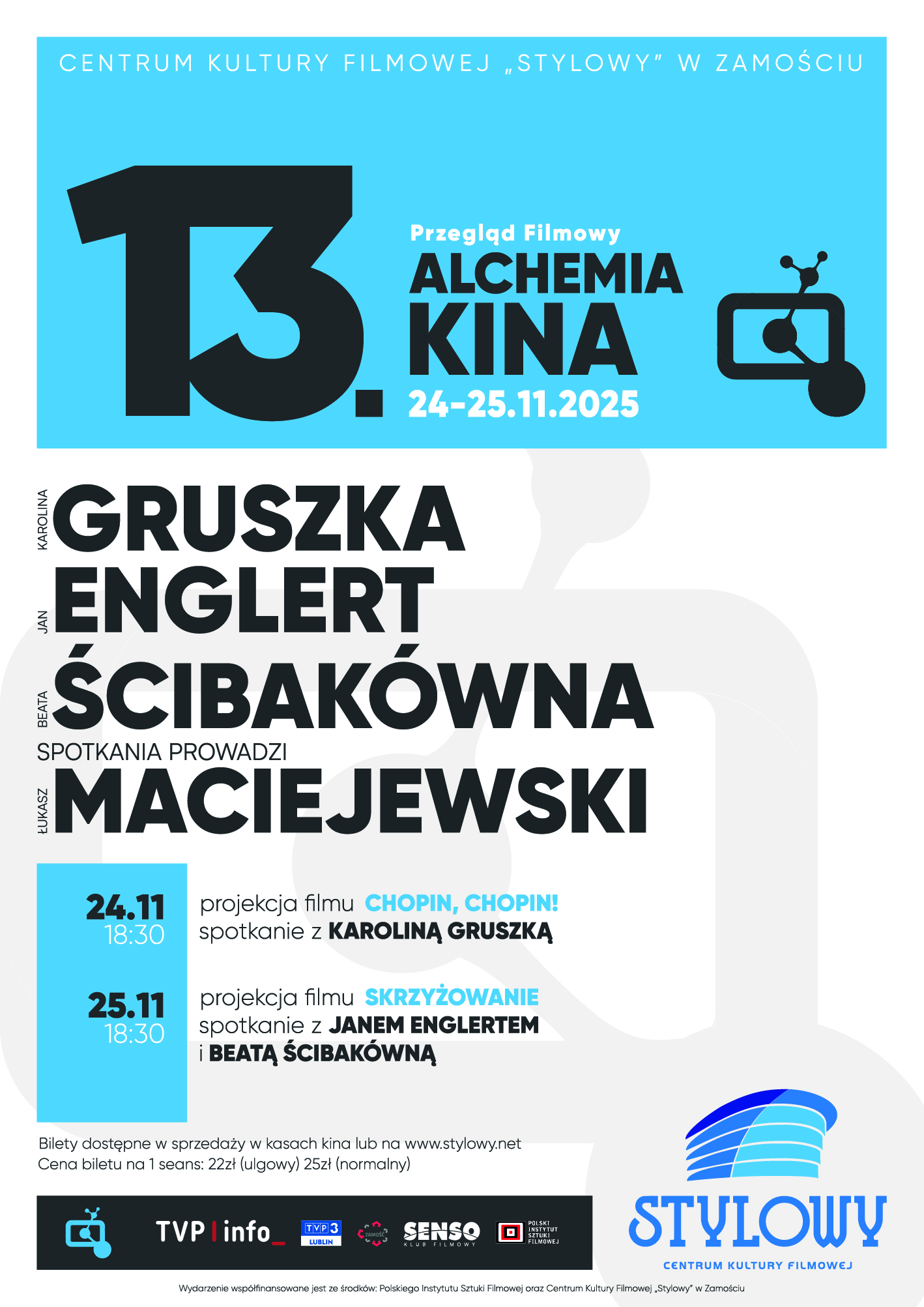 dodano: 06.11.2025Karolina Gruszka, Jan Englert i Beata Ścibakówna gośćmi 13. Przeglądu Filmowego ALCHEMIA KINA Promocja Polskiego Filmu. Spotkania z twórcami poprowadzi Łukasz Maciejewski – publicysta i krytyk filmowy. W alchemicznym repertuarze: "Chopin, Chopin!" oraz „Skrzyżowanie”. 13. Alchemia Kina odbędzie się w dniach 24-25 listopada 2025 godz. 18:30 w Centrum Kultury Filmowej „Stylowy” w Zamościu.