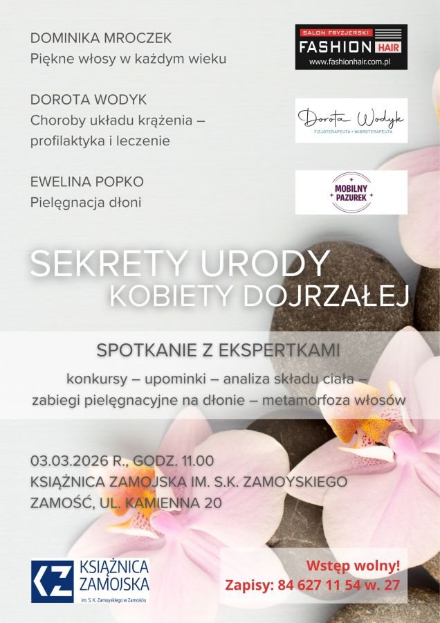 dodano: 30.01.2026Książnica Zamojska im. Stanisława Kostki Zamoyskiego zaprasza Seniorki na wyjątkowe spotkanie poświęcone zdrowiu, urodzie i dobremu samopoczuciu. Wydarzenie pod hasłem „Sekrety urody kobiety dojrzałej” odbędzie się 3 marca 2026 r. o godz. 11.00 w siedzibie biblioteki przy ul. Kamiennej 20 w Zamościu.