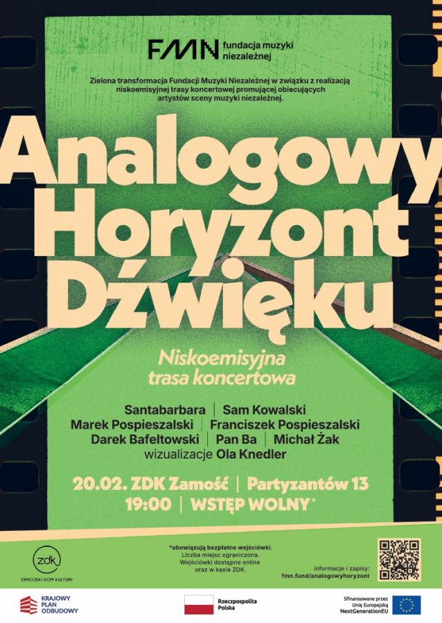 Wstęp na wydarzenia jest bezpłatny, obowiązują darmowe wejściówki do odbioru w sekretariacie ZDK od 27 STYCZNIA lub rezerwacja online na stronie: https://biletyna.pl/koncert/Analogowy-Horyzont-Dzwieku-Niskoemisyjna-Trasa-Koncertowa