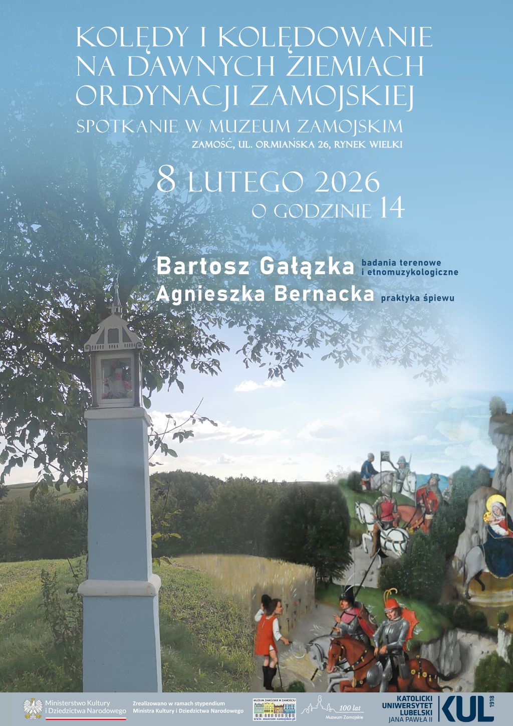 Spotkanie poprowadzi Bartosz Gałązka – etnomuzykolog ze Szkoły Doktorskiej Katolickiego Uniwersytetu Lubelskiego Jana Pawła II, stypendysta Ministra Kultury i Dziedzictwa Narodowego, który od lat prowadzi badania terenowe na obszarze południowej Lubelszczyzny. Prezentowane pieśni pochodzą z jego autorskiego zbioru, zgromadzonego podczas wieloletnich badań terenowych.