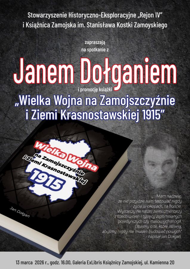 dodano: 11.03.2026Stowarzyszenie Historyczno-Eksploracyjne „Rejon IV” i Książnica Zamojska im. Stanisława Kostki Zamoyskiego zapraszają na spotkanie autorskie z Janem Dołganiem i promocję książki „Wielka Wojna na Zamojszczyźnie i Ziemi Krasnostawskiej 1915”.