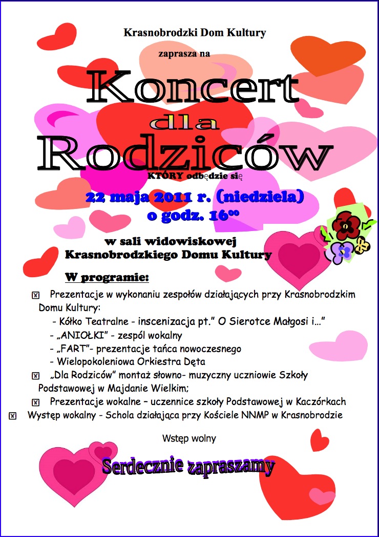 Krasnobrodzki Dom Kultury zaprasza na Koncert dla Rodziców, który odbędzie się 22 maja 2011 r. (niedziela) o godz. 16.00.