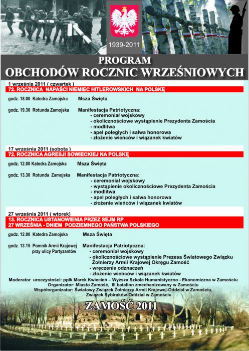 dodano: 31.08.2011Serdecznie zapraszamy do licznego udziału w zamojskich obchodach rocznic wrześniowych - 72. Rocznicy Napaści Niemiec Hitlerowskich na Polskę, 72. Rocznicy Agresji Sowieckiej oraz 13. Rocznicy Ustanowienia przez Sejm RP 27 Września Dniem Podziemnego Państwa Polskiego.