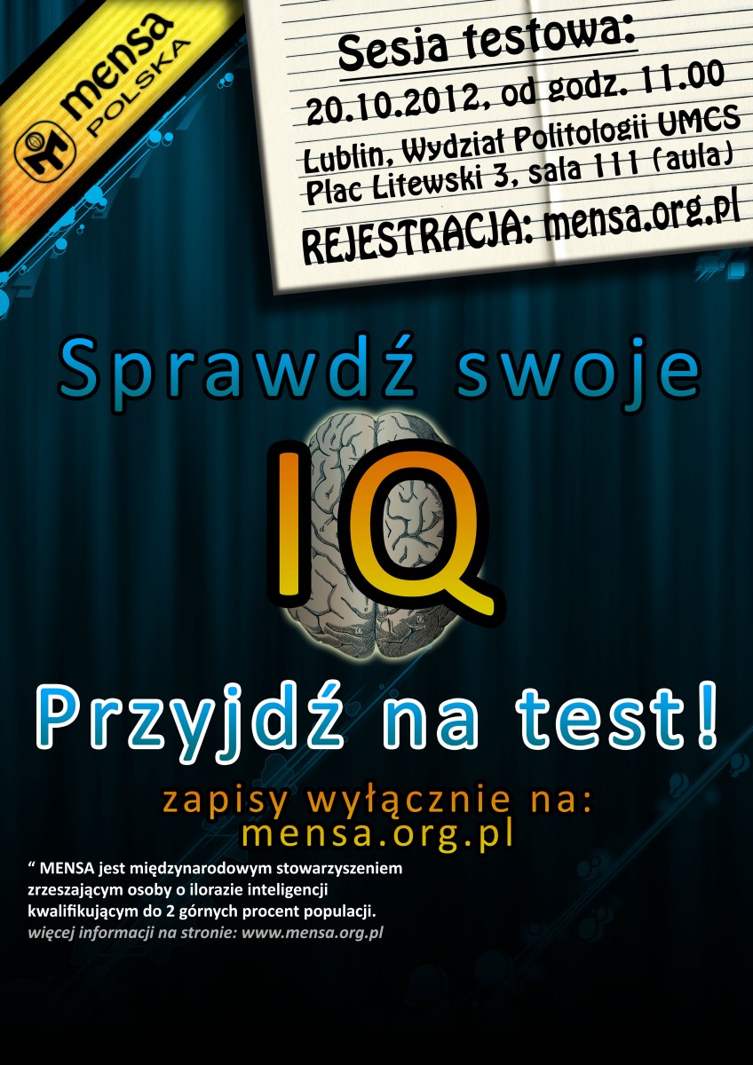 W sobotę 20 października w Lublinie zaplanowana jest sesja testowa kwalifikująca do Mensy Polskiej. Współorganizatorem sesji jest Politologiczne Koło Naukowe UMCS.