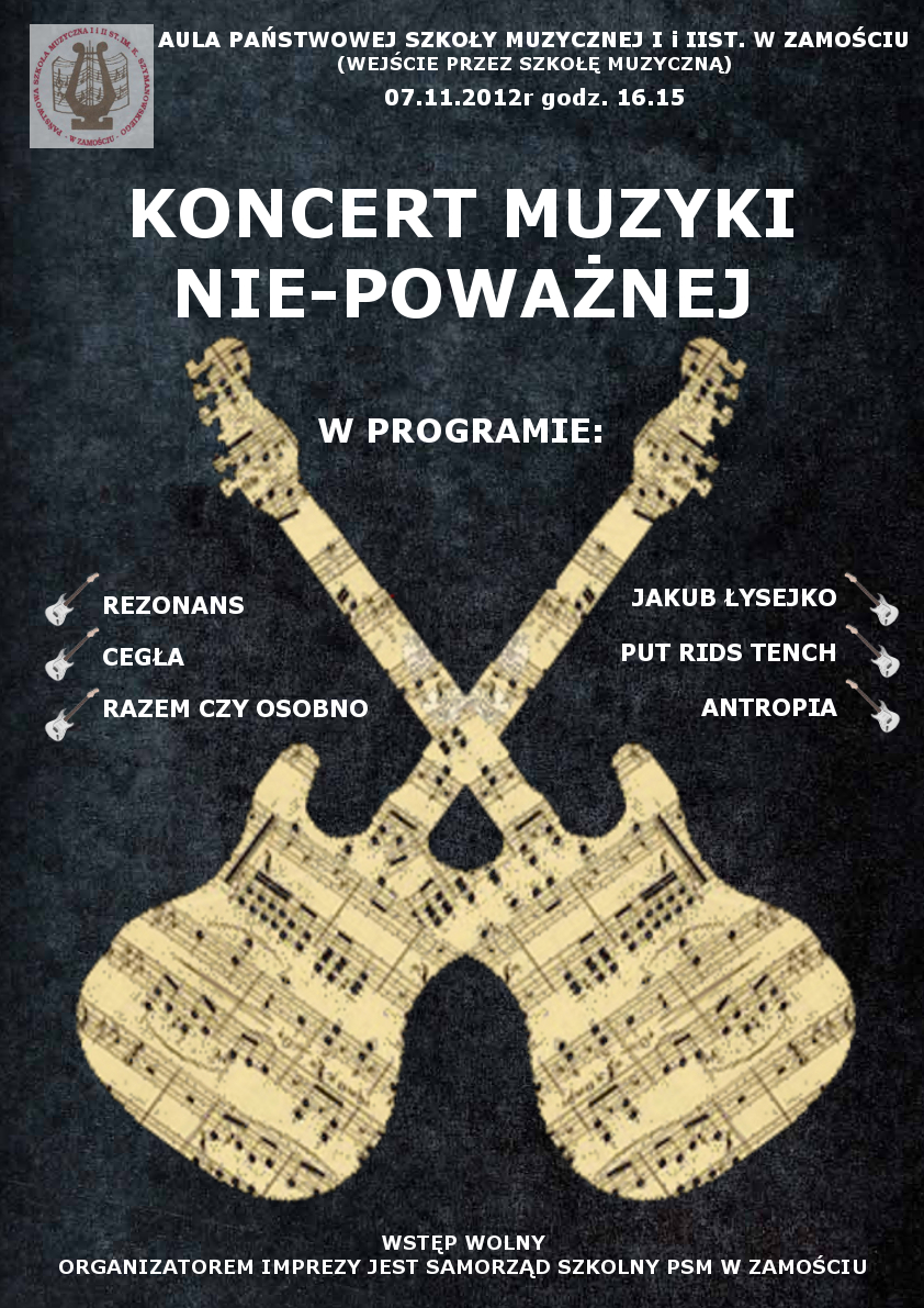dodano: 05.11.2012Państwowa Szkoła Muzyczna w Zamościu organizuje koncert otwarty „Muzyki (nie) poważnej”. Impreza odbędzie się 7 listopada o godz. 1615 w sali koncertowej Szkoły.